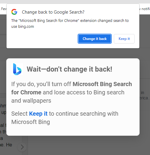 Meanwhile, if you were wondering what the cola wars of 2023 might look like, I will leave you with this screenshot. Earlier today I downloaded Bing and set it as my default search browser to skip the waitlist. Google did not like that too much.